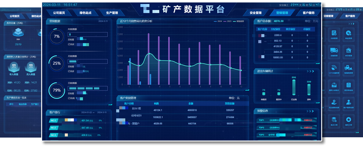 通过无人值守及手动称重方式实现高效的原料入场、销售出场、自动结账。实时监管数据采集、传输、存储、分析、应用、管理、发布一体化监管。强化车辆运输信息化、智能化管理,及时有效地监控和处理车辆违规运输行为。